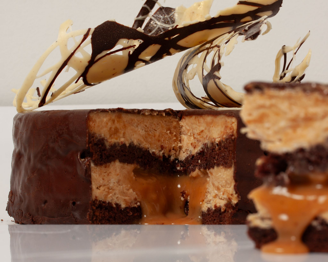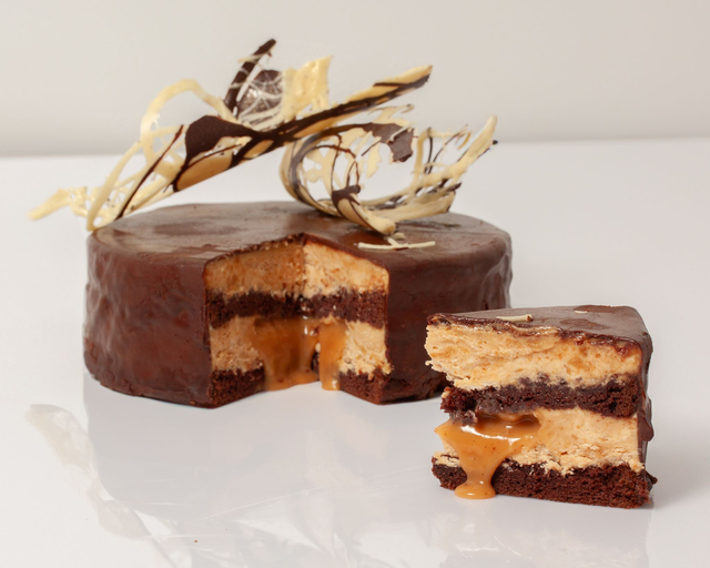 Inspired by the iconic flavour combination, this indulgent cake features two layers of rich, moist chocolate sponge filled with smooth peanut butter mousse and a thick layer of liquid salted caramel. Glazed in glossy dark chocolate ganache, it’s the perfect balance of sweet, salty, and nutty – a luxurious take on the classic Snickers profile.